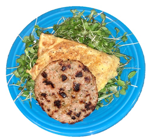 | 1 Applegate Chicken & Apple Sausage Patty 1/2c Microgreens 1 Egg Optional: 1oz Goat cheese Optional: Julian Bakery | Calories 140 kcal (+80 for cheese, +90 for wrap) Carbs 6g (+1 for cheese, +15 for wrap) Protein 12g (+5 for cheese, +3 for wrap) Fat 9g (+6 for cheese, +5 for wrap) Fiber 0g (+9 for wrap), Sugar 1g, Cholesterol 0mg (+25 for cheese), Sodium 285mg (+91 for cheese, +85 for wrap) |
